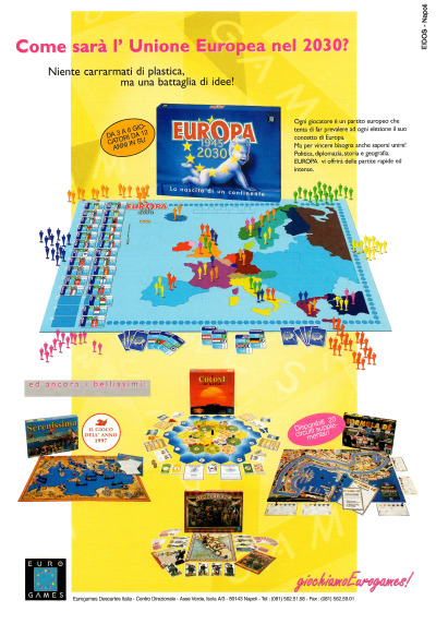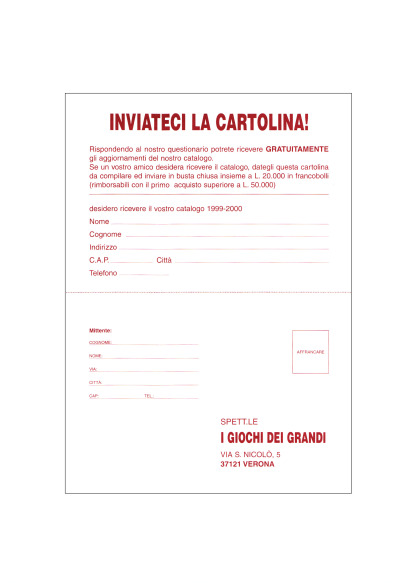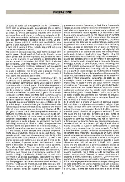L'inizio del 1999 è stato caratterizzato dalla precisa sensazione che le vendite abbiano ripreso ad essere più omogenee. Molti negozi, che avevano limitato la loro azione a Magic, si sono riavvicinati al mondo dei giochi di ruolo e delle miniature e ci hanno chiesto di aiutarli a partire con il piede giusto, proponendo un assortimento iniziale di questi prodotti. Noi siamo convinti che in ogni città ci sia spazio per uno o più negozi specializzati. Molti dettaglianti cercano disperatamente degli articoli con i quali sia possibile realizzare degli incassi reali, senza doversi accontentare di margini ridicoli per poter competere con la grande distribuzione. I nostri prodotti non entreranno mai nella grande distribuzione, che non è in grado, anche volendolo, di trattarli nel modo dovuto. Sono i negozianti che devono avere le idee chiare e usare l'intraprendenza necessaria per essere al passo con i tempi. Ma questo compito va supportato dai giocatori, i quali devono chiedere con insistenza ai negozi di giochi, fumetti e modellismo della loro città di trattare questi prodotti. Non arrendetevi di fronte all'eventuale reazione scettica e poco entusiasta di chi vi ascolta; non pensate che, tanto, questi giochi si possono lo stesso ordinare per posta presso I Giochi dei Grandi. Chiedete al negoziante se è contento di vendere Trivial Pursuit guadagnandoci 10.000 lire, perché di più non si può, altrimenti vanno tutti a comprarlo alla Standa, oppure se vorrebbe trattare degli articoli nuovi, moderni, che piacciono ai giovani, che non richiedono investimenti esorbitanti e che non lo costringono a confrontarsi ad armi impari contro i colossi della distribuzione! Ogni nuovo negozio che si avvicina ai giochi da noi descritti in questo catalogo è un ulteriore avamposto, che si aggiunge a quelli già esistenti e che può contribuire ad allargare i nostri confini. C'è ancora molto da fare per sviluppare i giochi intelligenti in Italia e tutti coloro che amano questo hobby dovrebbero offrire una piccola collaborazione. Ora rilassatevi e leggetevi con calma il catalogo che abbiamo preparato per voi. Da quest'edizione potrete consultarlo anche via Internet, visionando il nostro nuovo sito, che viene aggiornato in tempo reale. Potrete cliccare sui giochi che v'interessano per avere informazioni e in molti casi troverete anche disponibile l'immagine della copertina. Come il catalogo che avete in mano, anche il sito verrà continuamente migliorato, per offrirvi uno strumento sempre più utile e pratico per orientarvi nei vostri acquisti. Mi auguro che quest'ulteriore balzo in avanti contribuisca a rafforzare il nostro rapporto con la clientela, che da tanto tempo ci gratifica e dimostra di apprezzare il nostro lavoro, il nostro impegno e soprattutto la nostra continuità. Decine di ditte appaiono, scompaiono, cambiano denominazione e a volte lasciano poche tracce dietro di sé. Mi auguro che l'aquila de I Giochi dei Grandi, che da 18 anni rimane un punto di riferimento per migliaia d'appassionati, continui a volare alto!