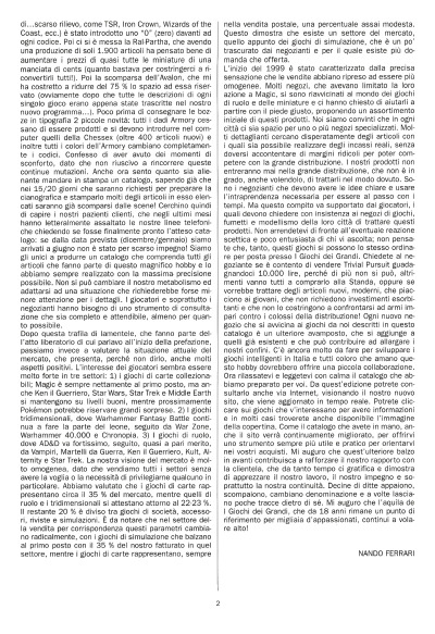 È noto a tutti che noi ci occupiamo, dal lontano 1981, di un settore che è sempre stato considerato, da parte di molti operatori commerciali, come una specie di grande occasione alla portata di pochi. Il potenziale rappresentato dai giochi di ruolo, i giochi tridimensionali (quelli con le miniature), i giochi di simulazione, i giochi di società di alto livello e, da pochi anni, i giochi di carte collezionabili è infatti stato sfruttato solo in minima parte e questo per una serie di motivi sui quali poi approfondiremo il discorso. Quello che invece è noto solo a chi ha seguito questo particolare mercato è il fatto che negli ultimi tempi ci sono stati dei grandi cambiamenti, che hanno notevolmente rivoluzionato le posizioni che molte ditte si erano conquistate nel tempo. Il dilagare di Magic, gioco di carte che è diventato quasi un fenomeno di costume tra molti giovani, ha fatto lievitare in modo considerevole il fatturato di molte case produttrici, dei distributori specializzati e di tutti i negozi che hanno saputo cogliere la palla al balzo, in particolare negli anni della Magic-mania (dal 1994 al 1996).